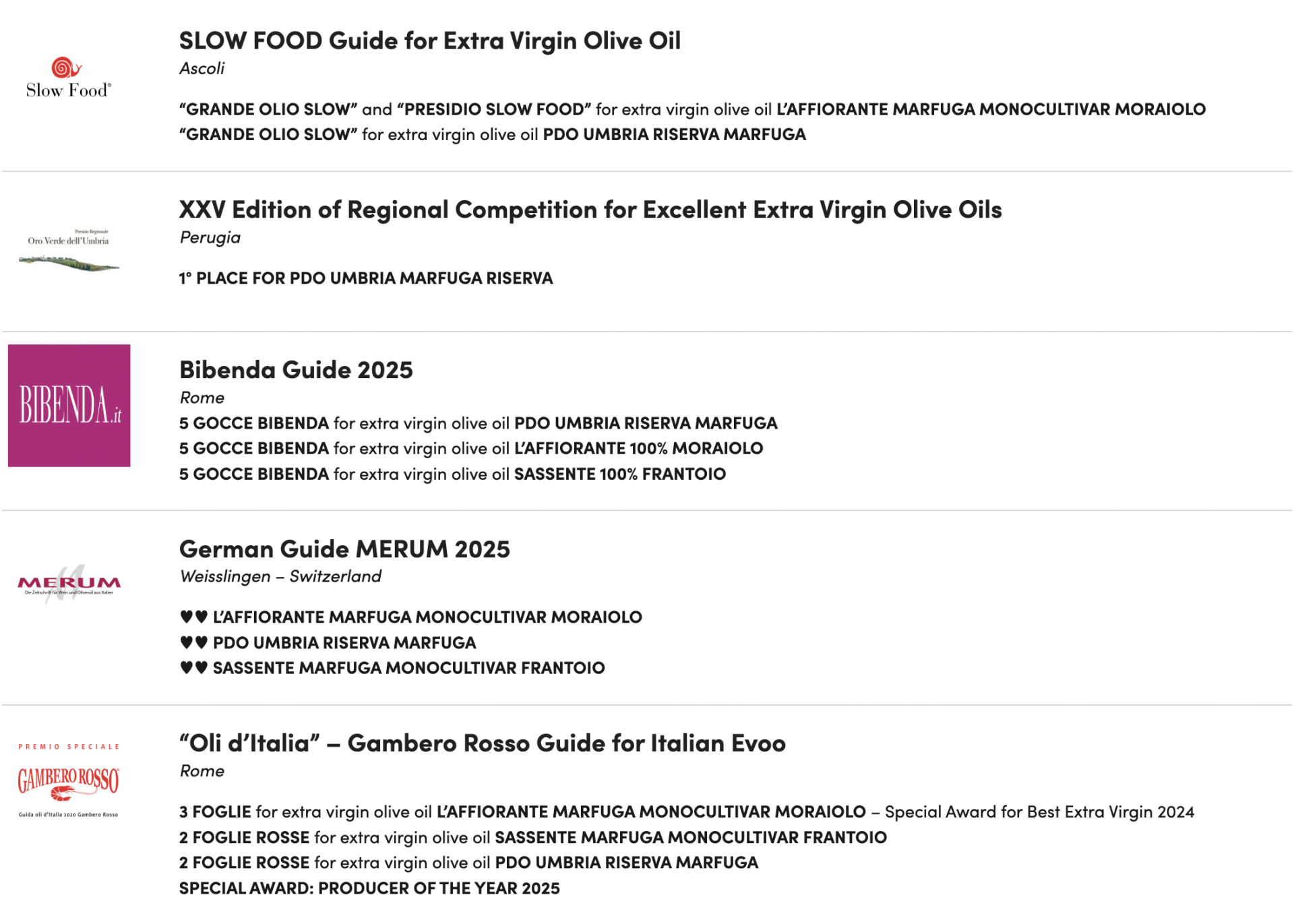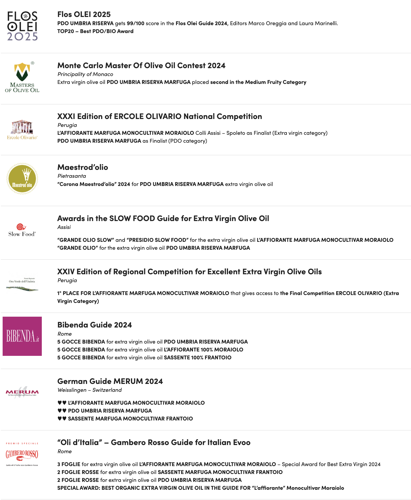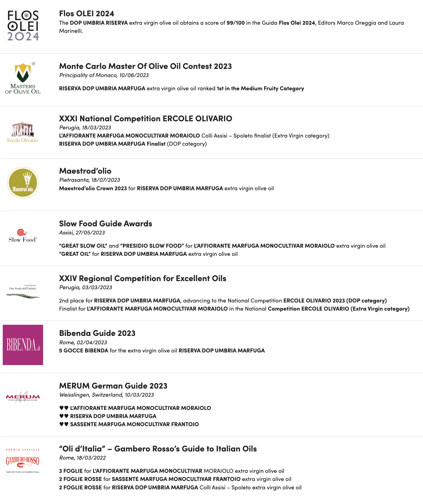 마르푸가는 감베로로쏘와 플로스올레 외에도 SLOW FOOD, Bibenda Guide, MERUM, Monte Carlo Master Of Olive Oil Contest, ERCOLE OLIVARIO National Competition,