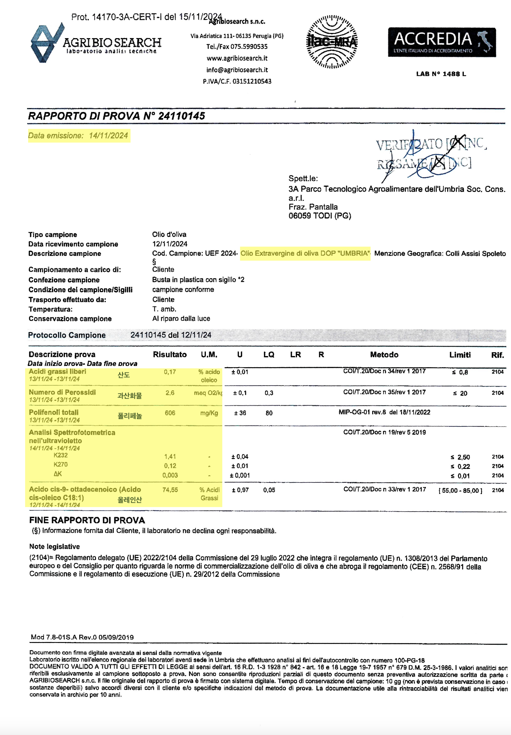 A. 엑스트라버진 올리브오일을 판매처에서 산도, 폴리페놀 등의 수치를 성적서 없이 임의로 명기하거나, 오래 전의 성적서를 올리는 경우가 너무 많습니다. 해당 제품이 2024/2025 하비스트 제품이라면, 반드시 성적서가 2024년 10월 이후에 발행되었는지 확인하시고, 제품명이 실제 제품과 동일한지 확인하시기 바랍니다. 올리브오일 생산자는 10개 이상의 올리브 오일 제품을 생산하는 경우가 많으므로 더 고가의 올리브오일로 시험 성적서를 받을 수 있습니다.